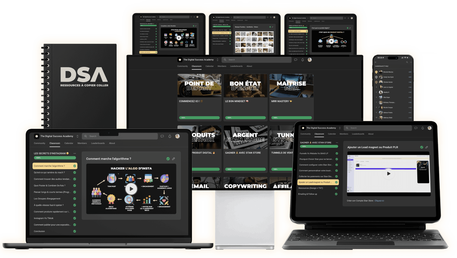Tu reçois la formation Digital Success Academy et aussi l'accès à une communauté gratuite d'entrepreneurs du monde entier, tout niveaux d'expérience confondu, prêts à se connecter avec toi et te soutenir !